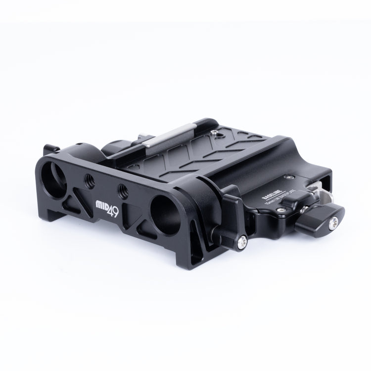 ARRI dovetail slot on the bottom attaches to Baseline ARRI Dovetail or other ARRI standard dovetails using a top-load locking mechanism. Loosen the thumbscrew and push the silver button on the operator's side to release the baseplate from the ARRI dovetail. To reattach, drop down and listen for the pop to know it has engaged. Adjust the position on the ARRI dovetail, then lock the ratcheting thumbscrew.