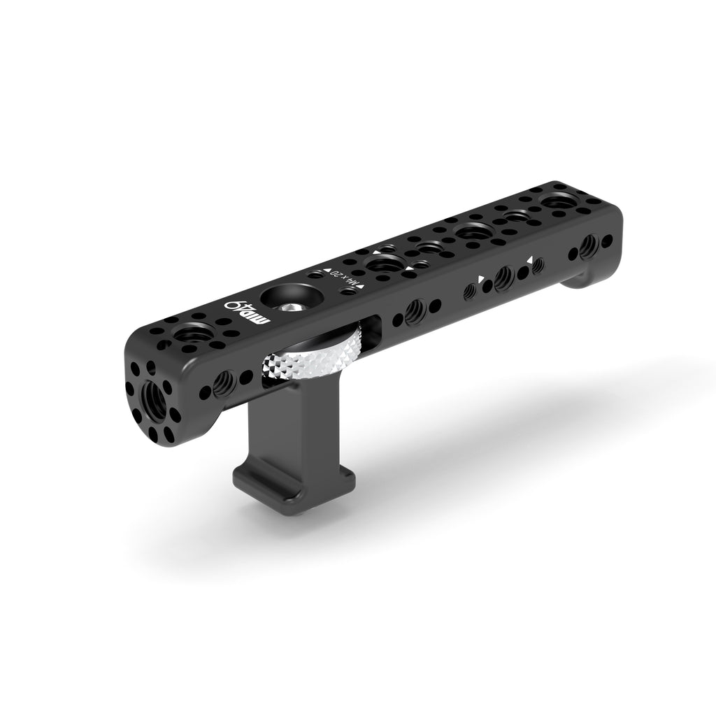 Bolt On Top Handle (ARRI 1/4-20) is a top handle that attaches to a 1/4-20 hole with 3mm locating pin holes spaced 10.4mm center to center (ARRI standard).