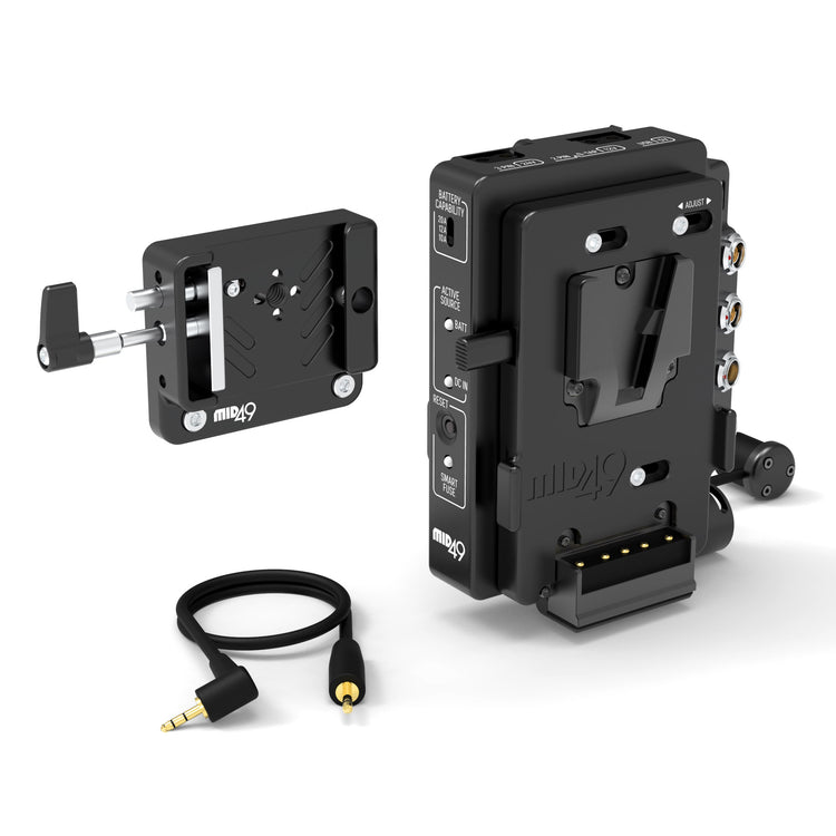 Power Distribution Box DB-10 (Canon C400, V-Mount) attaches to the back of the camera using the included ARCA Backpack and provides intelligent power distribution with D-Taps, 5V USB-C PD, 3pin Fischers, and 2pin LEMO compatible connectors. Removable REMOTE LANC cable enables remote start/stop capability using 3pin Fischer devices.