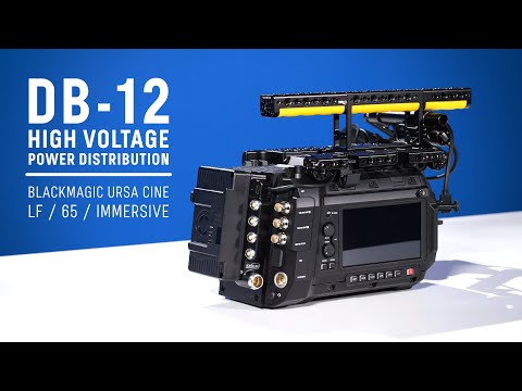 Power Distribution Box DB-12 (Blackmagic URSA Cine, V-Mount High Voltage) attaches directly to the camera body using five M3 screws and provides intelligent power distribution with D-Taps, 5V USB-C PD, 3pin Fischers, and 2pin LEMO compatible connectors.
