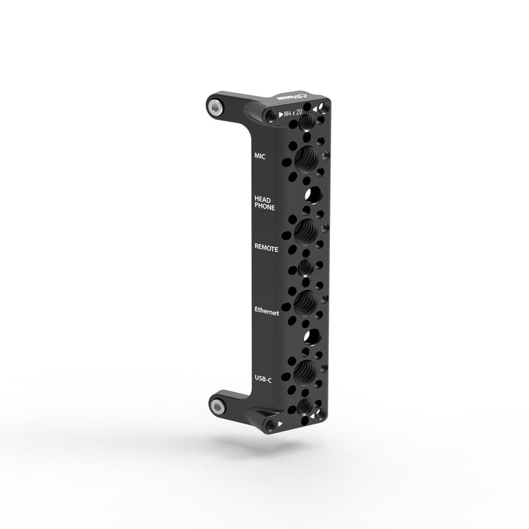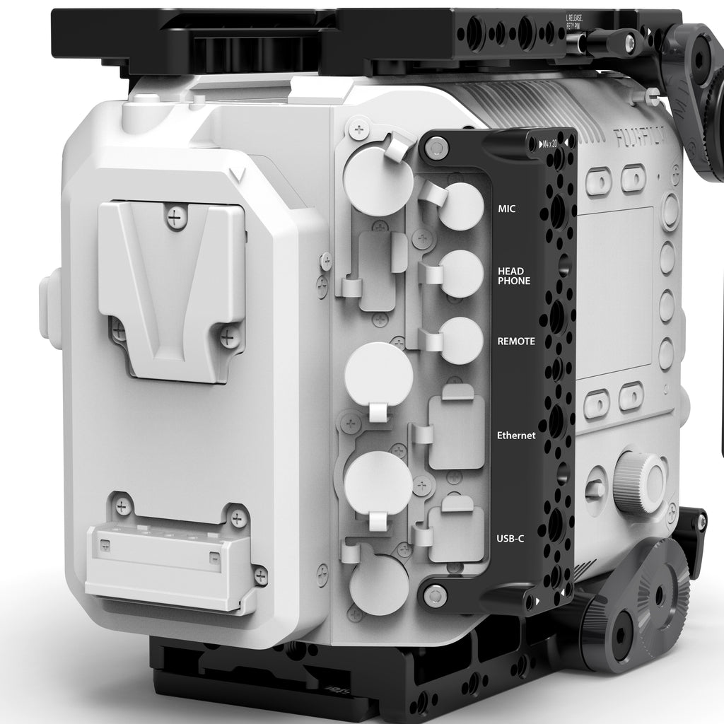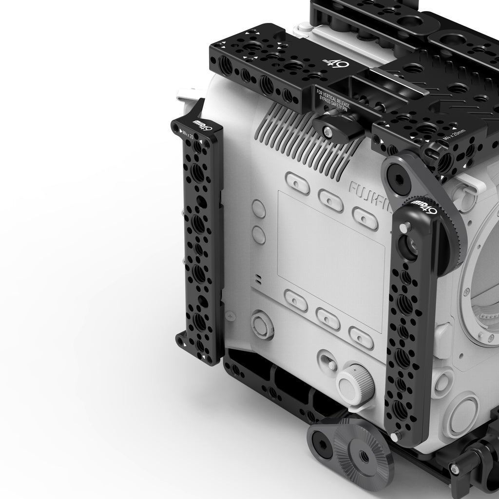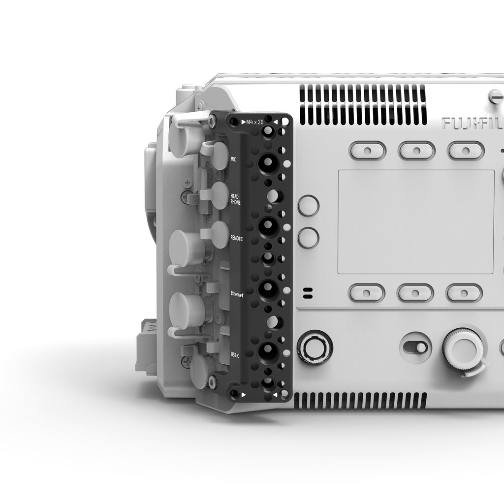 Right Rear Bracket (FUJIFILM GFX ETERNA 55) attaches in place of the camera's connector guard and provides 1/4-20 and 3/8-16 mounting points with ARRI locating pin holes. M4x20mm MAP holes are also available for adding Single Rod Clamps and other accessories.