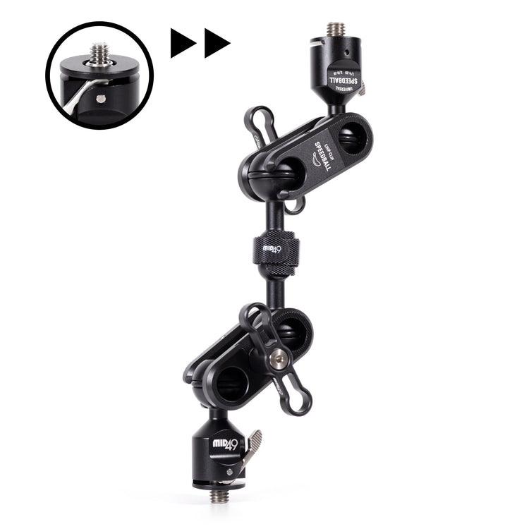 Universal Speedball Monitor Arm (3 Inch) is an articulating arm with combination 1/4-20 and 3/8-16 mounting screws on each end, two double-ball clamps, and one 3 inch (75mm) extension with velcro cable wrap.