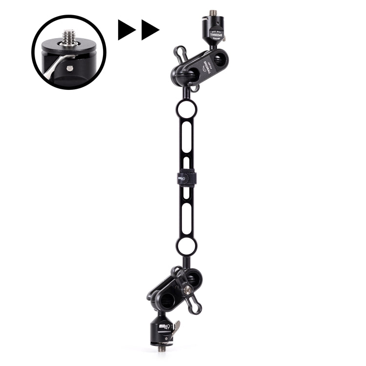Universal Speedball Monitor Arm (9 Inch) is an articulating arm with combination 1/4-20 and 3/8-16 mounting screws on each end, two double-ball clamps, and one 9 inch (225mm) extension with velcro cable wrap.
